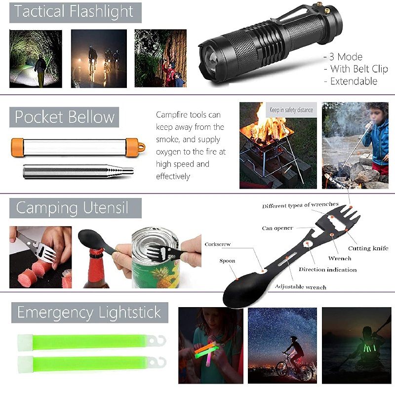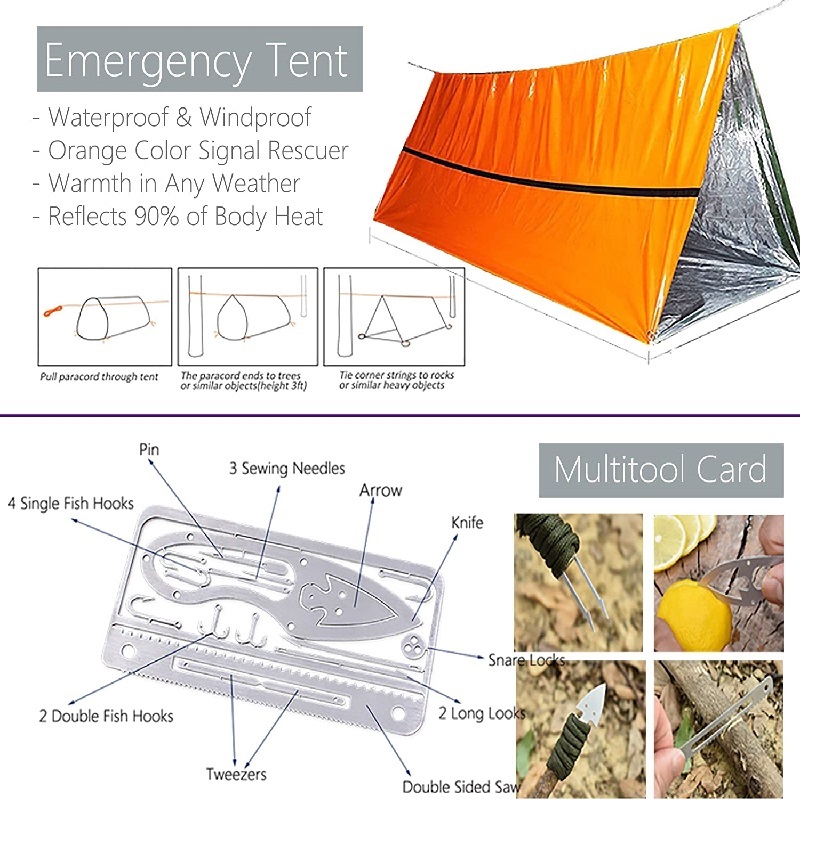 Sistema di sopravvivenza completo comprende 12 attrezzi di sopravvivenza multiuso, nonché una tenda di emergenza e una coperta, ma anche un kit di avviamento per il fuoco, un pacchetto di attrezzi da pesca e un kit di pronto soccorso da 75 pezzi, che soddisfa le vostre diverse esigenze.