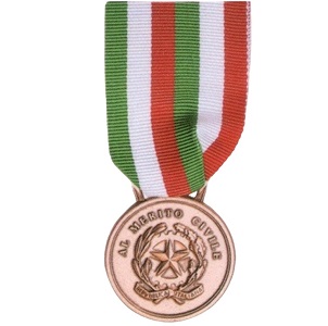 La medaglia in metallo dorato reca a rilievo, sul fronte la stella della Repubblica Italiana sormontata dalla dicitura in lettere lapidarie romane AL MERITO CIVILE.