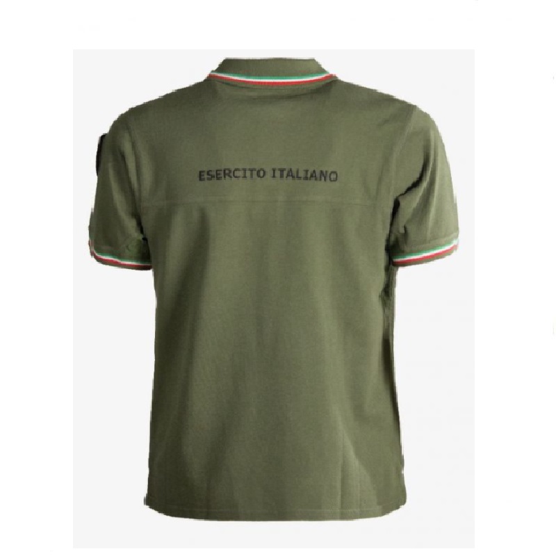 Polo Esercito Italiano di ordinanza con nuovo logo Esercito con stella, in cotone con 3 bottoni in tinta, bordo tricolore a collo e a maniche, fascia para sudore ascellare in tessuto tecnico traforato.