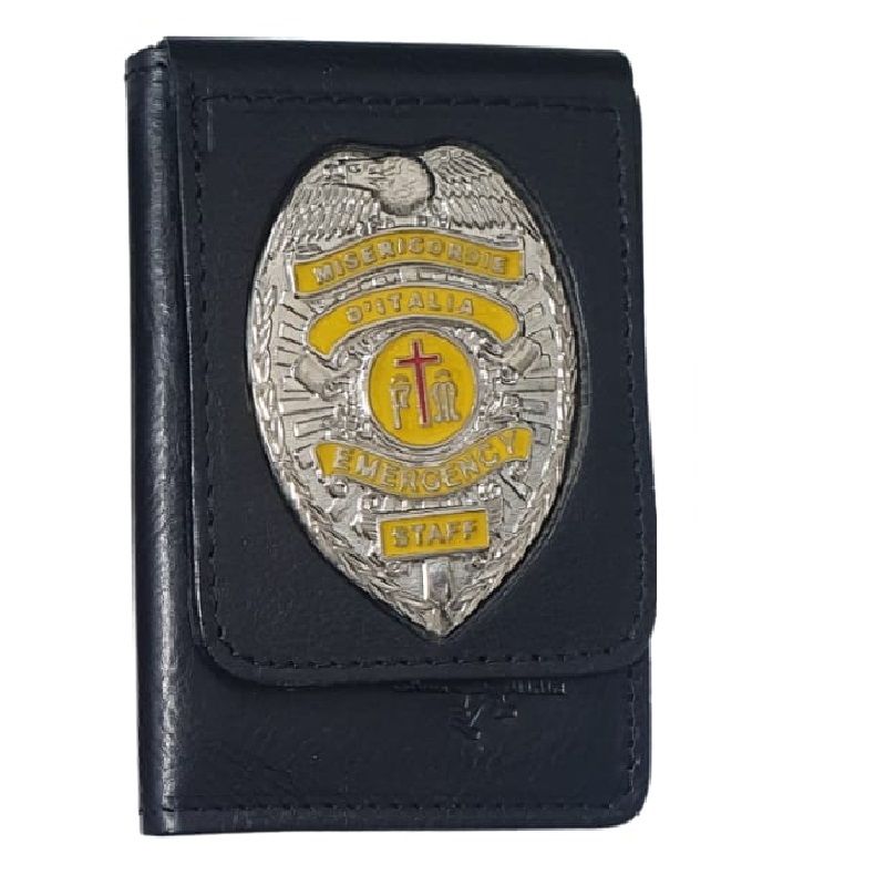 Portafogli in pelle con placca di metallo Croce Rossa.