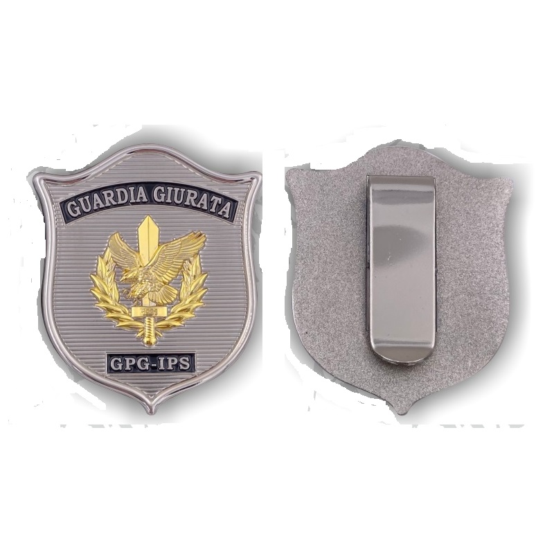 La placca è realizzata in pressofusione di metallo tridimensionale con doppia galvanica argento/oro, smalto nero e molla in ottone sul retro.